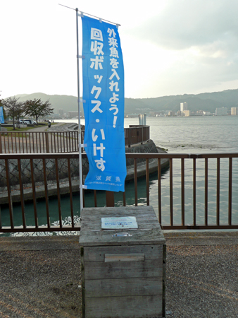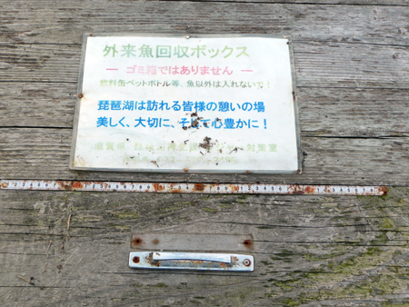 先日、滋賀県に帰郷したときに、久しぶりに琵琶湖の沿岸を歩きましたが、この「外来魚回収ボックス」(写真下方の木箱)の実物を、おそらく初めて近くで見ました。