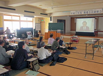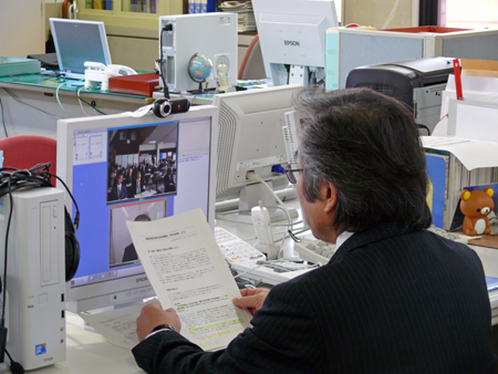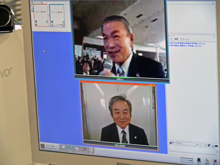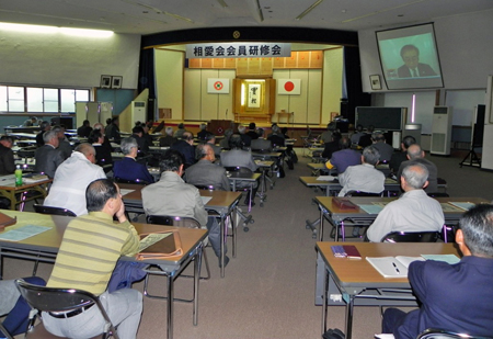 研修会の中で「ソーバミエルカ」(インターネットを活用したテレビ会議システム)を活用し、インターネットを通して、生長の家本部(東京都渋谷区)と愛媛県教化部(愛媛県松山市)を結んで、稙田茂樹・相愛会総轄実行委員長による約15分間の講話を中継しました。
